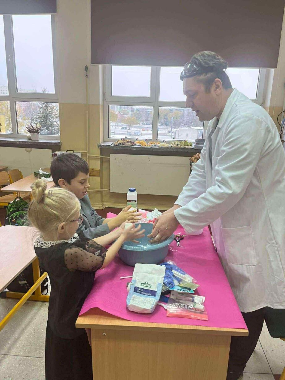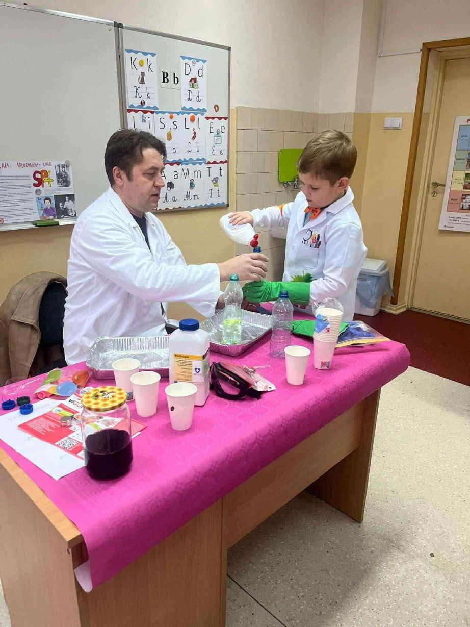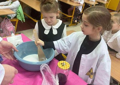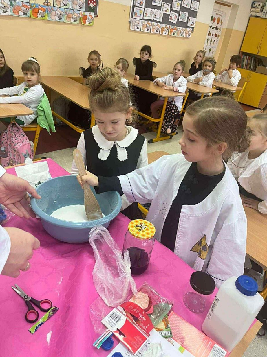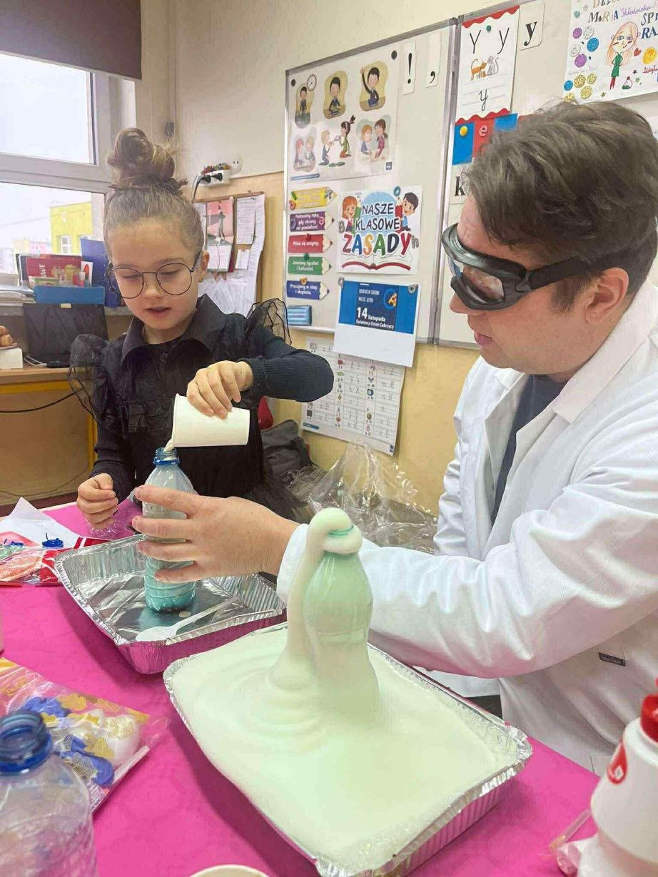 W dniu 26 listopada 2025 roku w naszej Szkole obchodzony był dzień patrona. Z tej okazji w klasie 1B zostały zorganizowane warsztaty chemiczne. Dzieci pod czujnym okiem chemika przeprowadzały liczne doświadczenia.