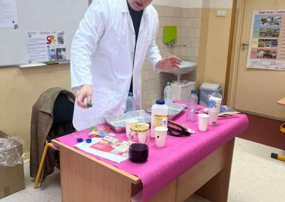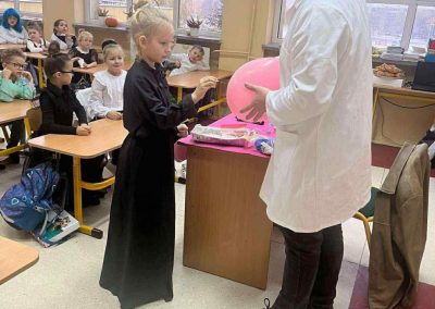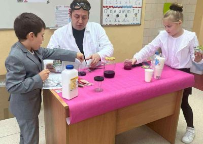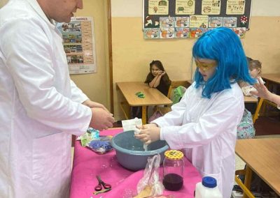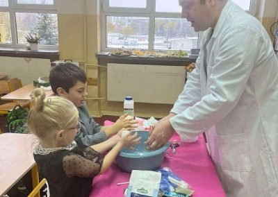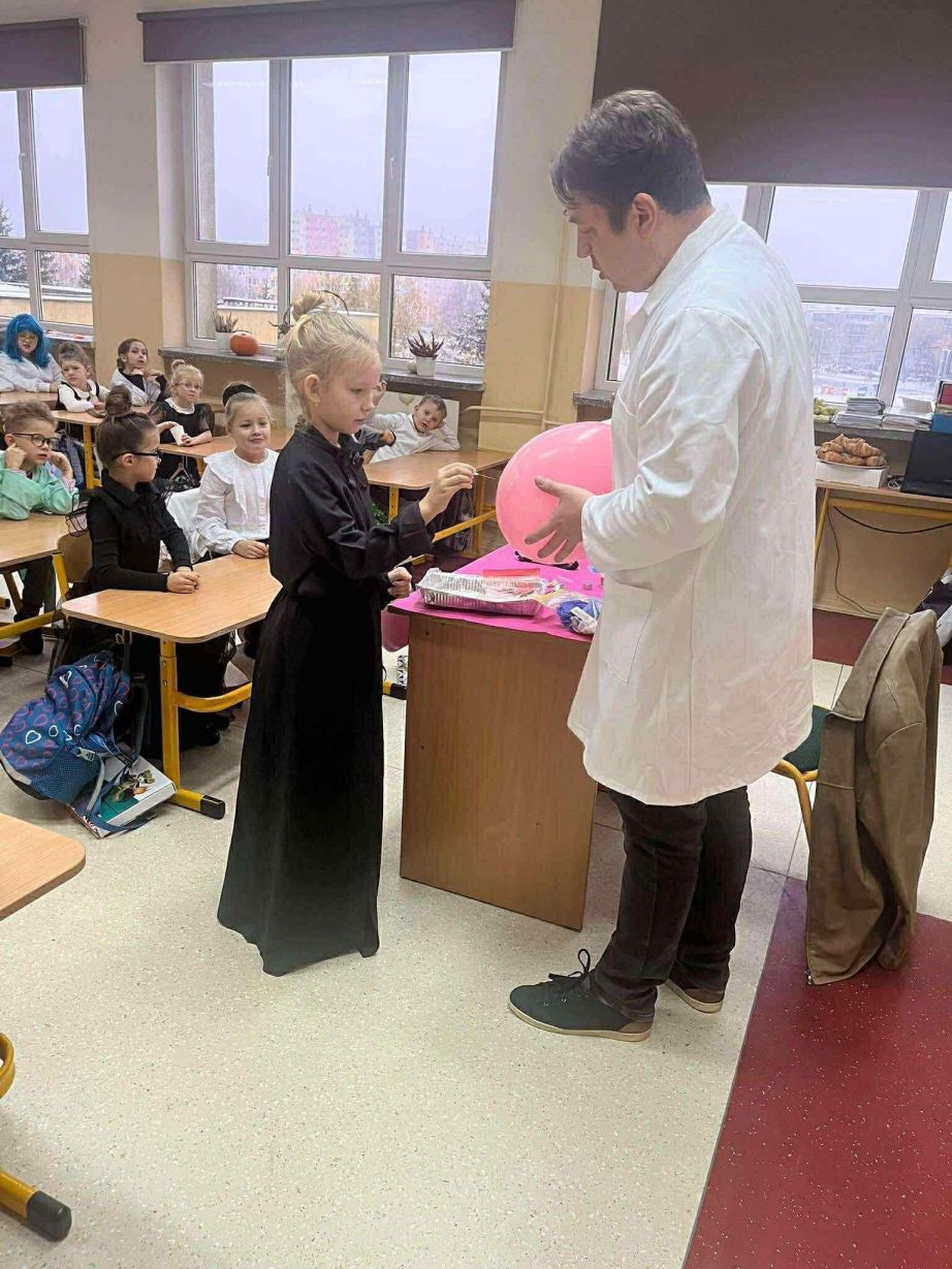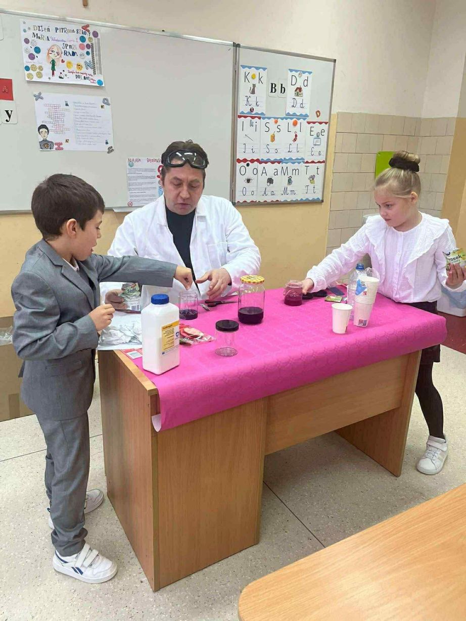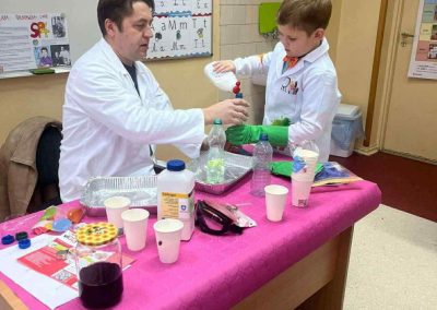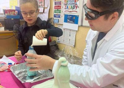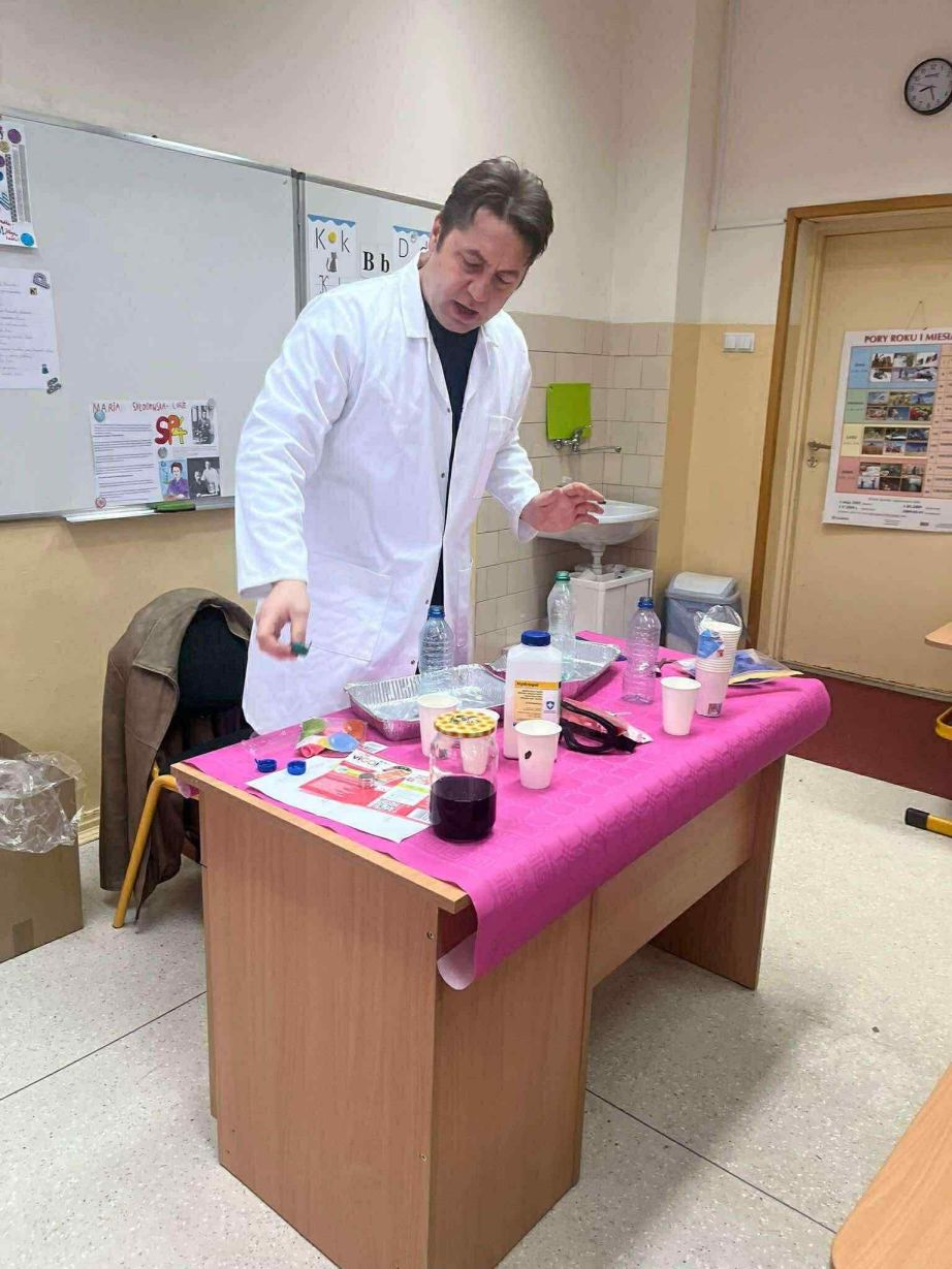 W dniu 26 listopada 2025 roku w naszej Szkole obchodzony był dzień patrona. Z tej okazji w klasie 1B zostały zorganizowane warsztaty chemiczne. Dzieci pod czujnym okiem chemika przeprowadzały liczne doświadczenia.