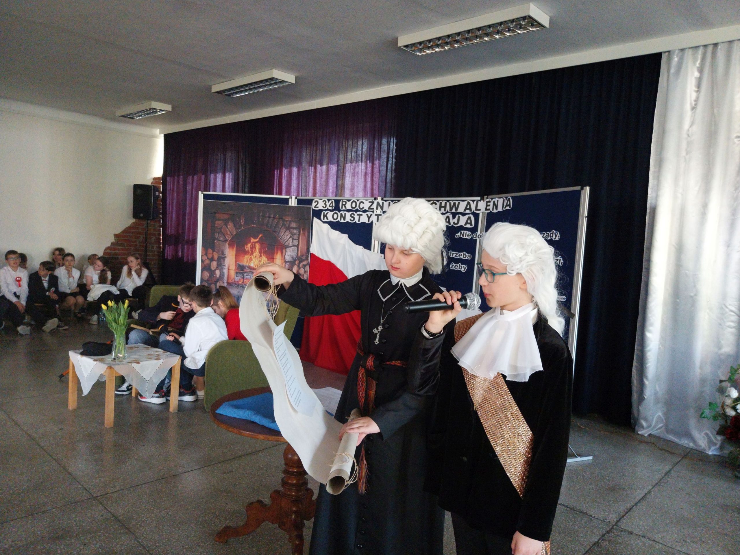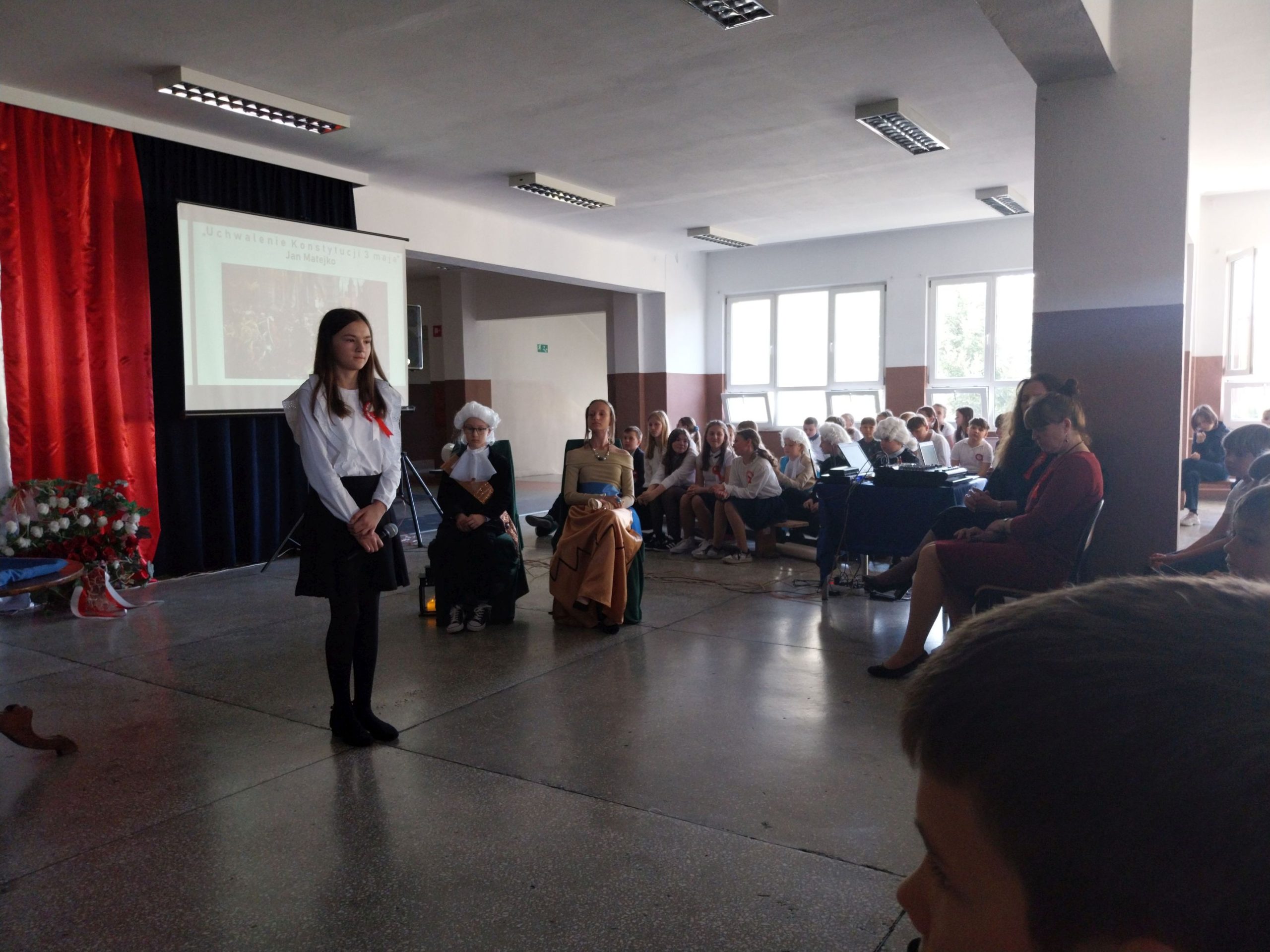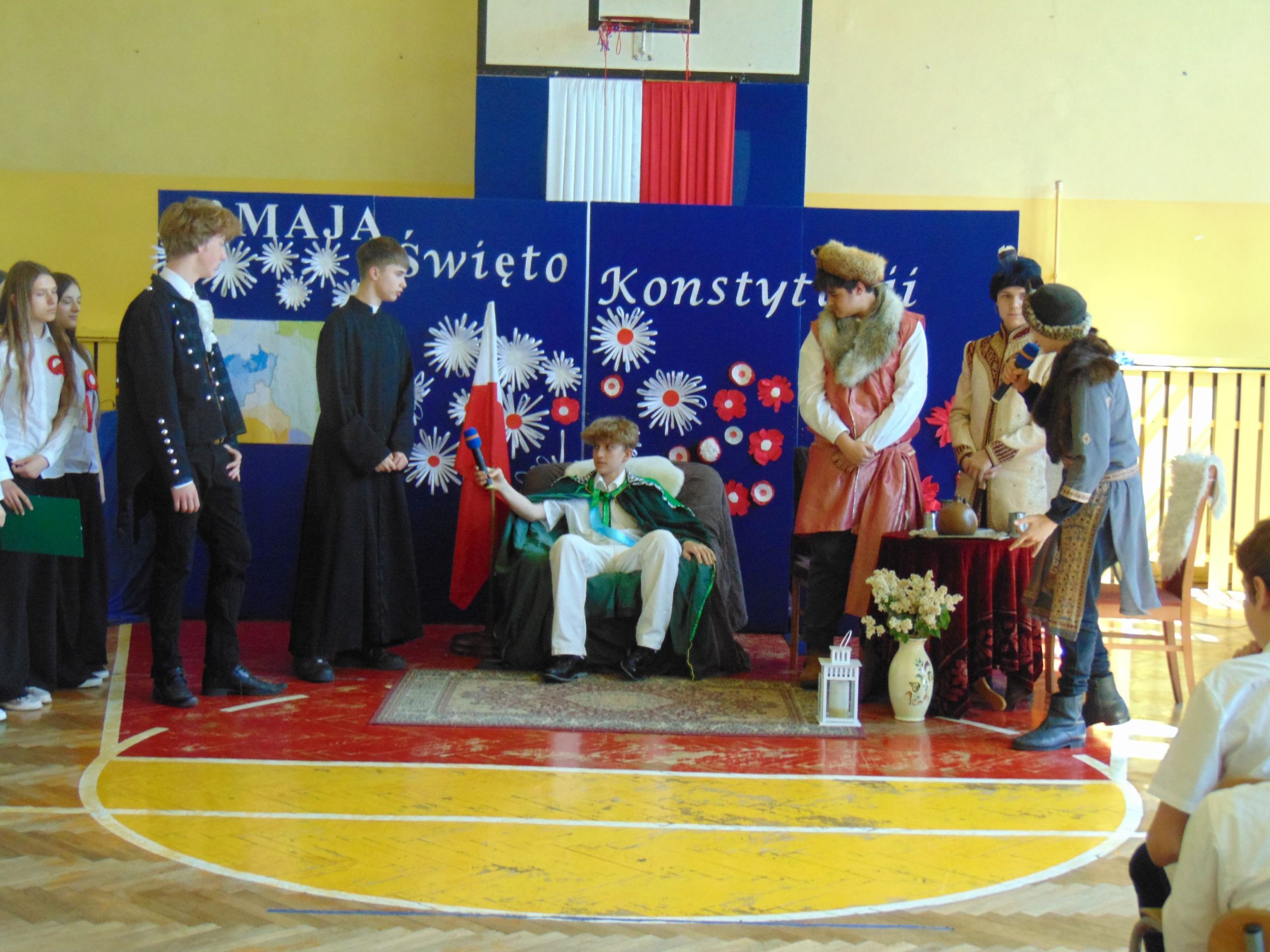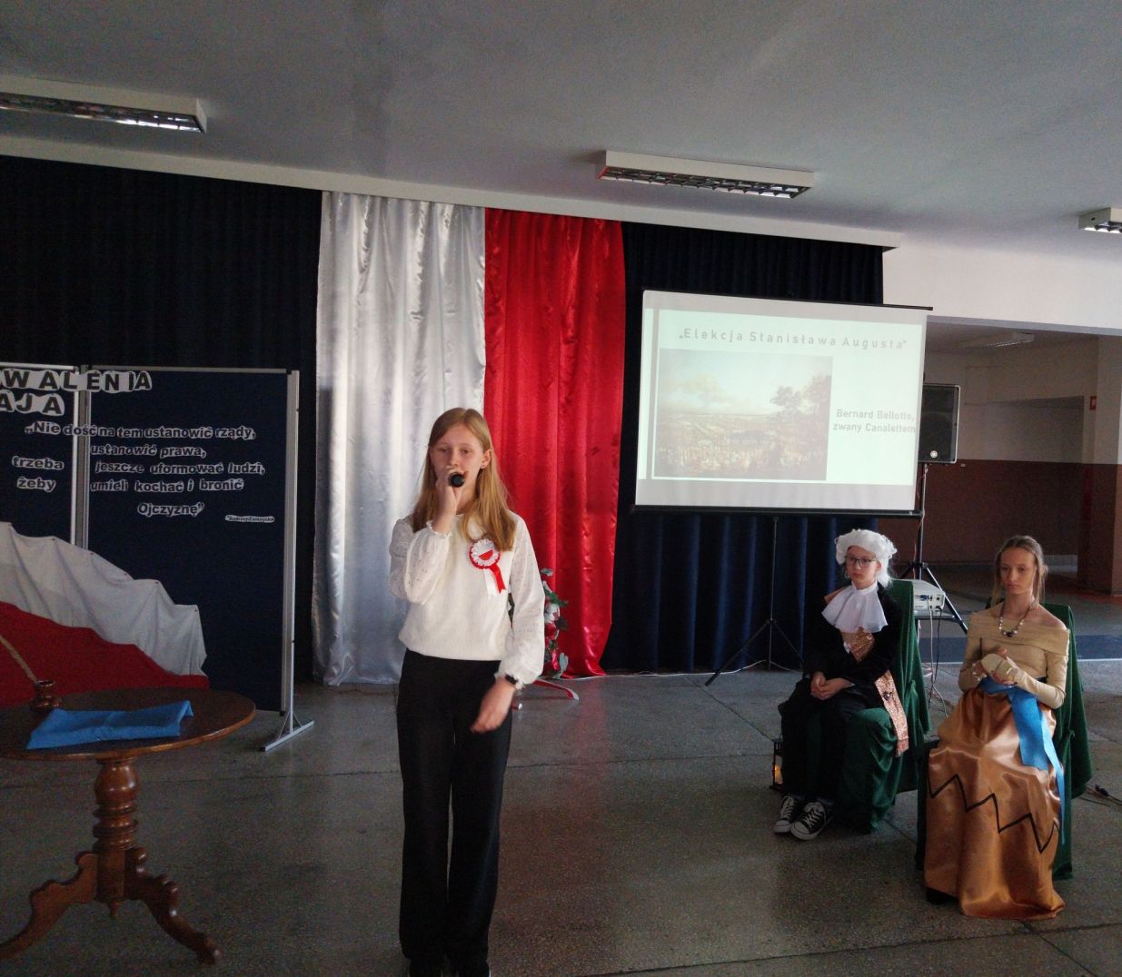 Wspaniale zaprezentowali się młodzi aktorzy, odtwarzając sceny z obrad Sejmu Wielkiego, z udziałem postaci takich jak król, szlachta, posłowie czy przedstawiciele stronnictw politycznych. Całość dopełniły poruszające utwory wykonane przez szkolny chór oraz piękne solo uczennicy z klasy 7.