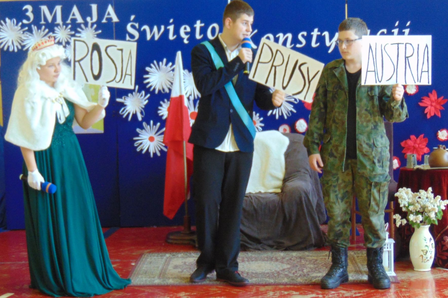 Przygotowana z tej okazji pod kierunkiem wychowawców klas 5 c i 5 e – pań Renaty Stasiewicz i Doroty Ryfki – inscenizacja przeniosła widzów w czasy panowania ostatniego króla Rzeczypospolitej, Stanisława Augusta Poniatowskiego. Przewodnikami po tym niezwykle trudnym okresie dziejów Polski byli dziadek (Julian Gładysz z klasy 5 e) i jego wnukowie (Julia Bodek, Gabriela Koncewicz i Piotr Sieczko również z klasy 5 e).