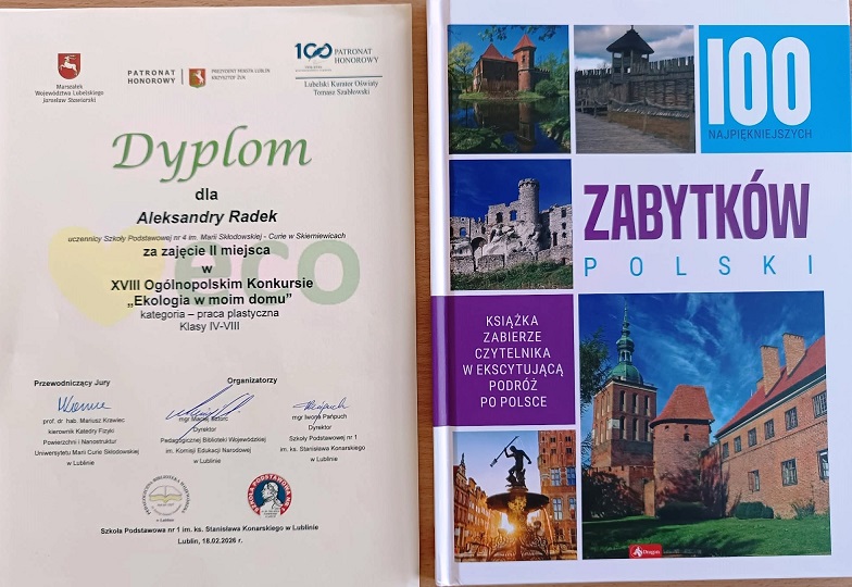 Aleksandra Radek z klasy 8a zajęła 2 miejsce w kategorii praca plastyczna w XVIII edycji Ogólnopolskiego Konkursu „Ekologia w moim domu”. Praca została wykonana pod kierunkiem nauczyciela plastyki Pawła Legięckiego.