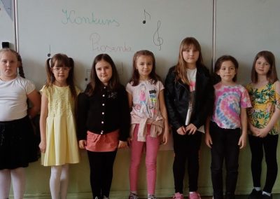 Dnia 27 kwietnia odbył się szkolny konkurs piosenki. Uczestnicy prezentowali różne utwory polskich wykonawców oprawione ciekawą choreografią i ubiorem. Do rywalizacji przystąpili reprezentanci klas 1-3. Spośród wykonawców utworów muzycznych jury wyłoniło następujących zwycięzców: